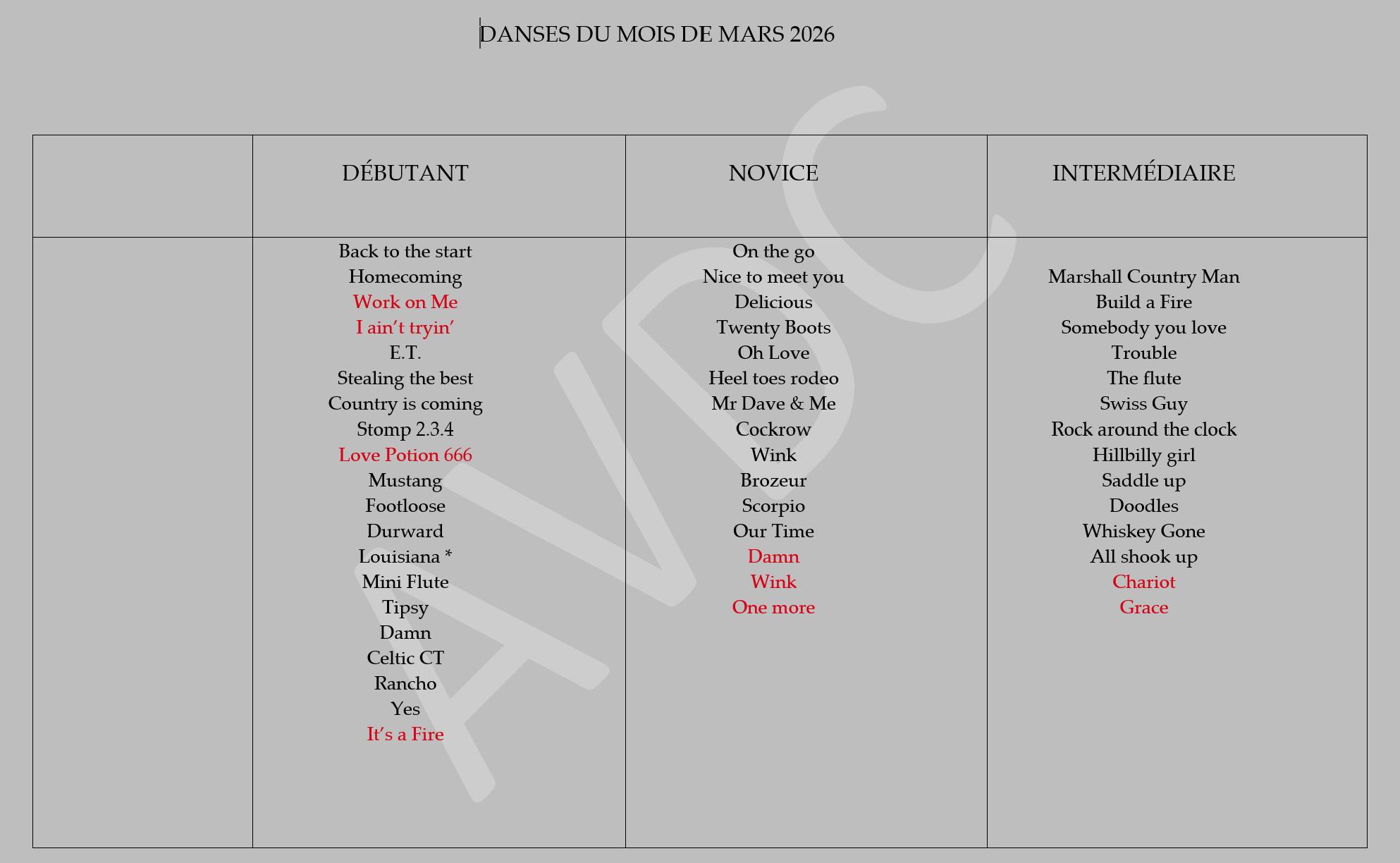 Cliquer ici: Danses de la semaine Danses du mois Vous trouverez toutes les chorégraphies en cliquant sur l'icône Country dance dans la colonne de gauche Nouvelle rubrique: Technique de danse Merci à Lilly West !! Nouvelles chorégraphies: Pim Pam FK & easy Retro Hoedown It's a fire One more Grace Scorpio Love potion 666 Chariot Damm Damm Work on me Whiskey's gone All shook up Durward Cockrow Swiss guy Stomp 2,3,4